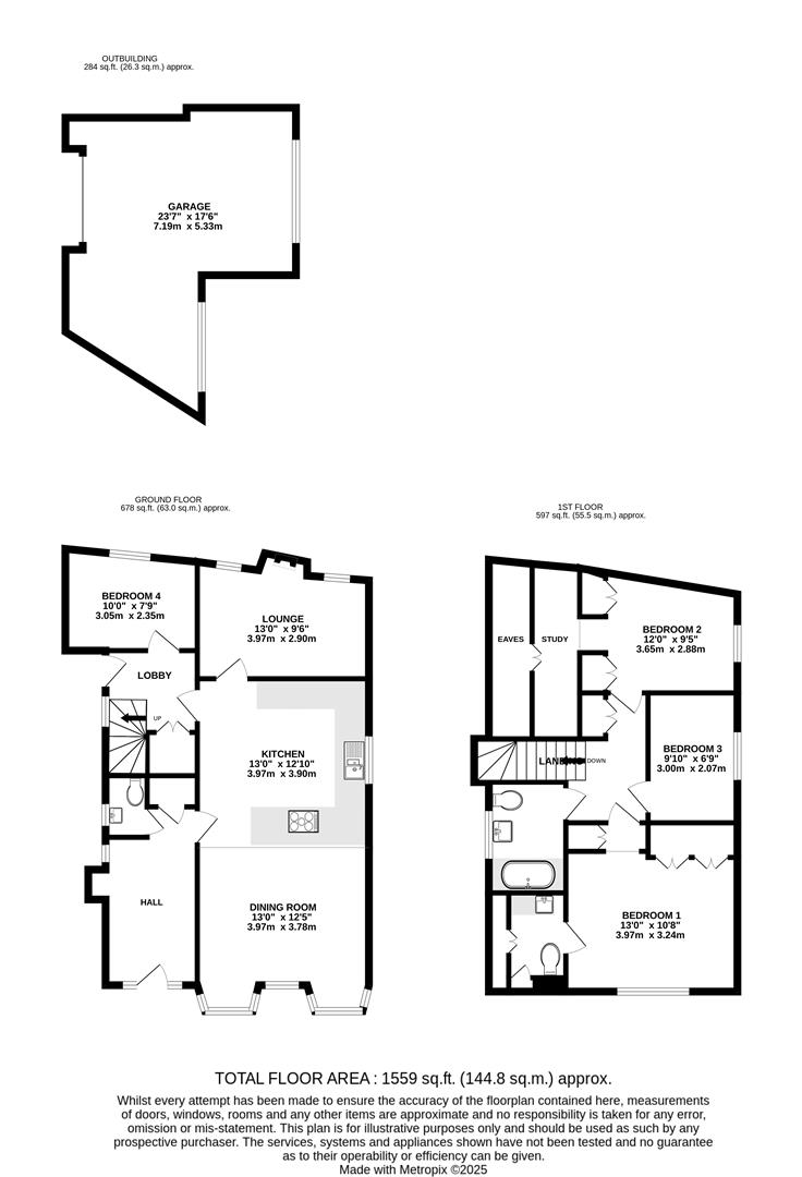 To the first floor, the landing includes built-in storage and leads to the bedrooms. The spacious primary bedroom benefits from fitted wardrobes, eaves storage and a private en-suite WC. Bedroom Two is another generous double, also featuring fitted wardrobes, a study/walk-in wardrobe area and eaves storage. Bedroom Three is a well-proportioned single room with access to the loft. The family bathroom is fitted with an enclosed bath with shower over, vanity wash basin and WC, complemented by tiled flooring and partly tiled walls.