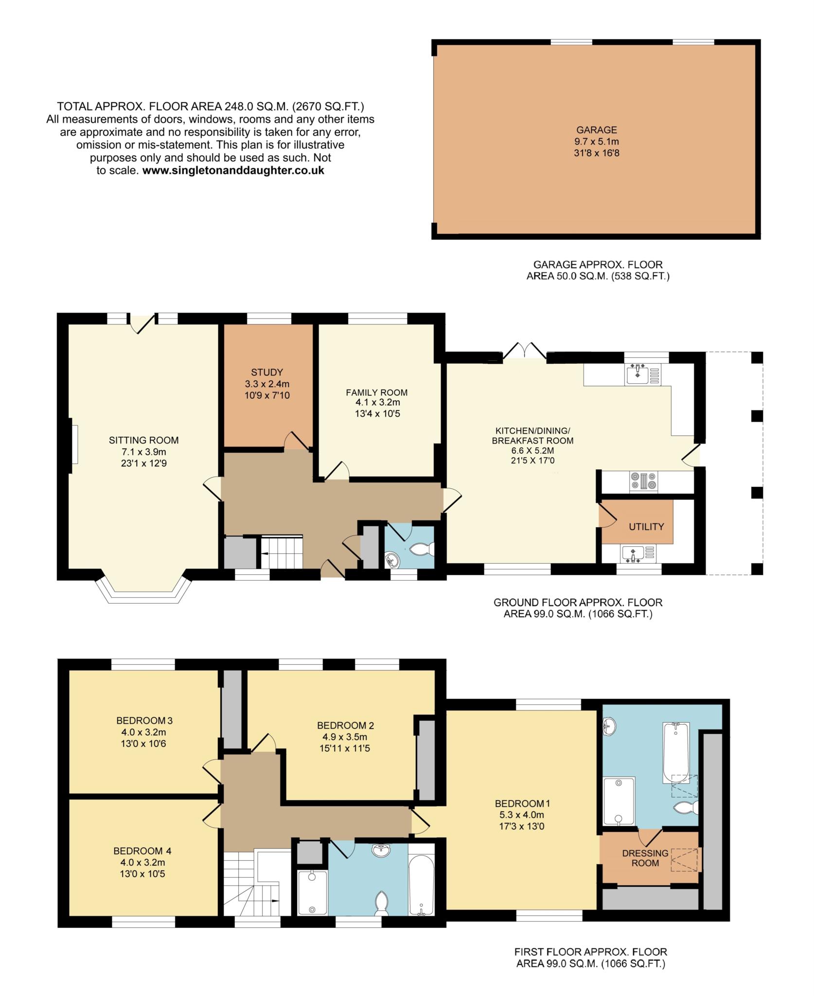 Summary of accommodation: Reception hall, sitting room, study, family room, kitchen/dining/breakfast room, utility, pantry, cloakroom, 4 double bedrooms, family bathroom. Bedroom 1 has a dressing room and ensuite bathroom.