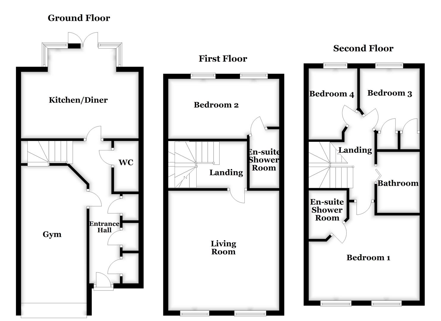 The accommodation briefly comprises of the entrance hall, gym (converted garage), downstairs w.c. and kitchen/diner. The first floor landing leads to the living room and bedroom two (with en suite shower room). A further set of stairs leads to three further bedrooms (bedroom one with en suite shower room) and the house bathroom/w.c. Outside to the front is a driveway providing off road parking and a slate area providing further off road parking. Whilst to the rear is a low maintenance enclosed paved patio area.