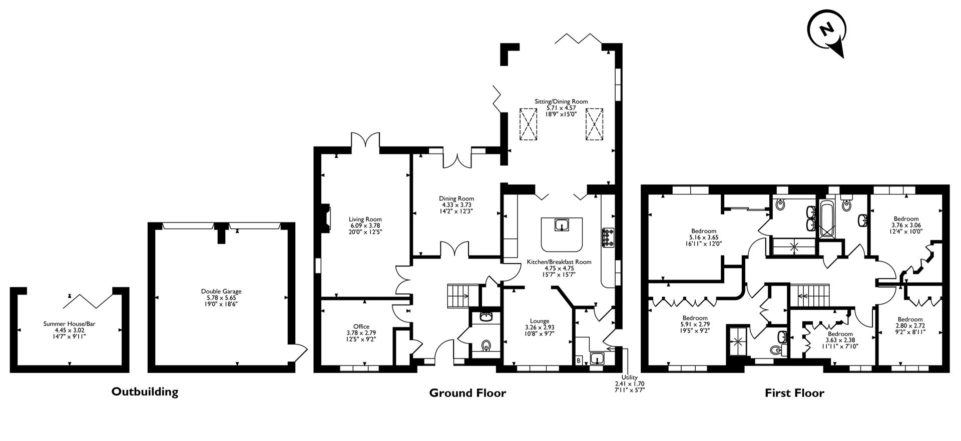 First Floor - The first floor accommodates four double bedrooms, a dressing room/single bedroom, and three bath/shower rooms. The two principal bedrooms both benefit from en-suite shower rooms and built-in storage, while the remaining two doubles also feature fitted storage and share a well-appointed family bathroom. The bathroom includes a shower bath, wash hand basin, low flush WC, and heated towel rail.