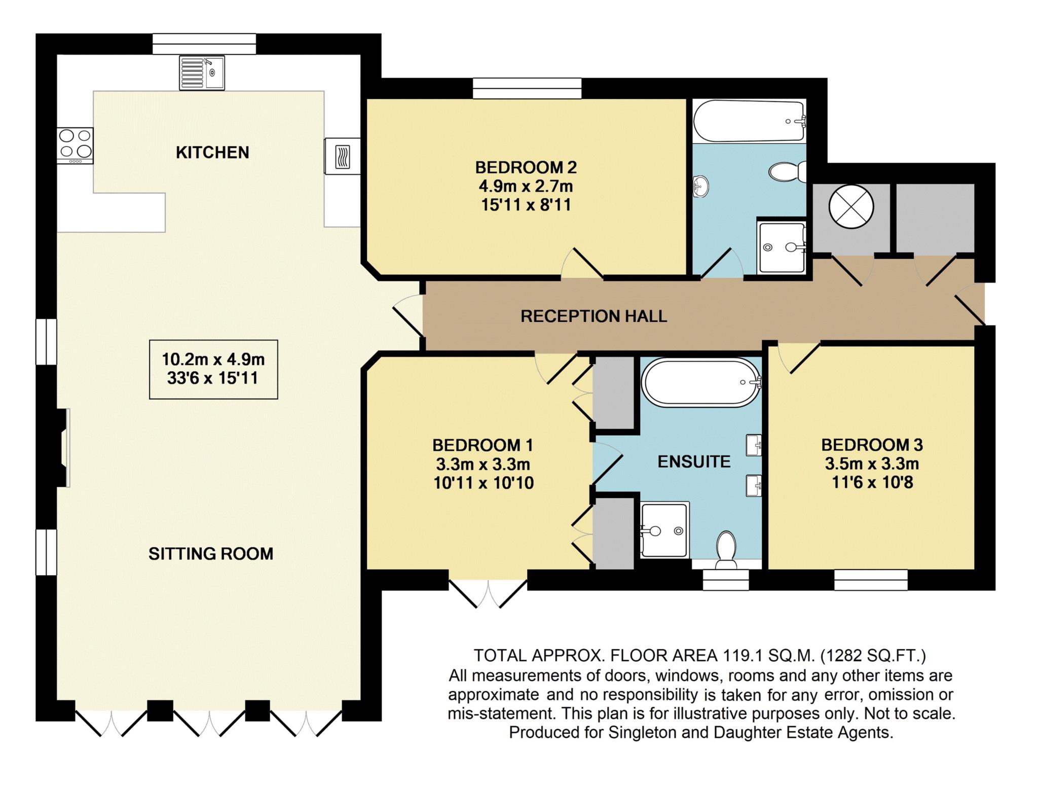 Summary of accommodation: Entrance hall, large kitchen/dining/living room, 3 bedrooms, 2 bathrooms.
