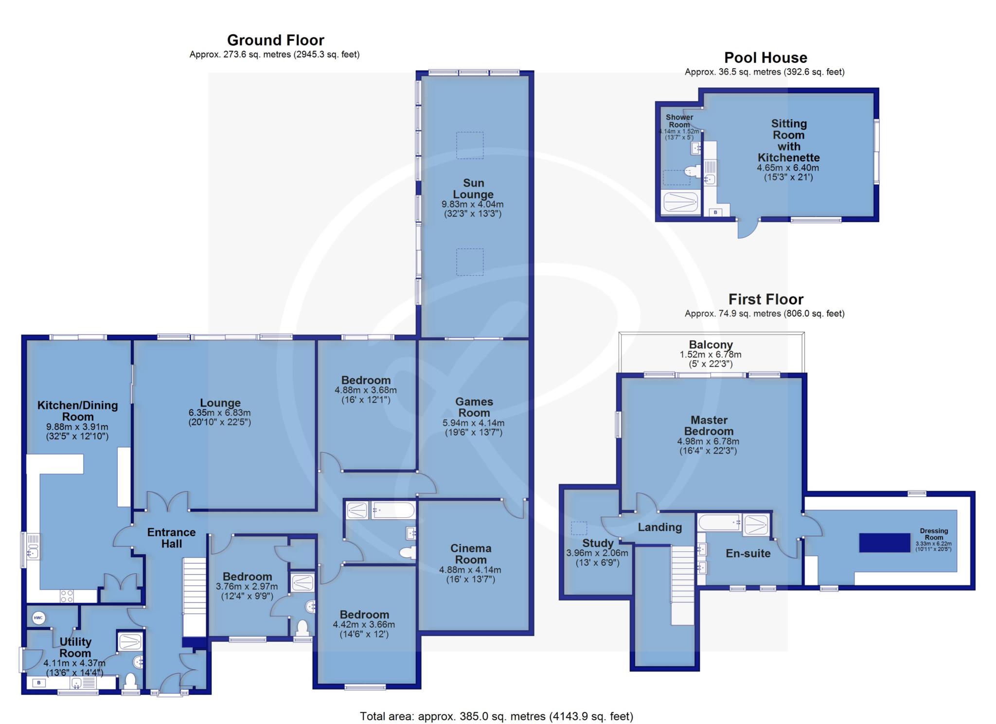 On the first floor is an impressive 22` Master Bedroom suite, with large windows taking full advantage of the stunning views with an outside Balcony overlooking the swimming pool. The bedroom continues into a good sized En-Suite & a large 20` Dressing Room with bespoke fitted cupboards, drawers, hanging rails and dressing table. There is also a useful Study/Office Room off the landing.