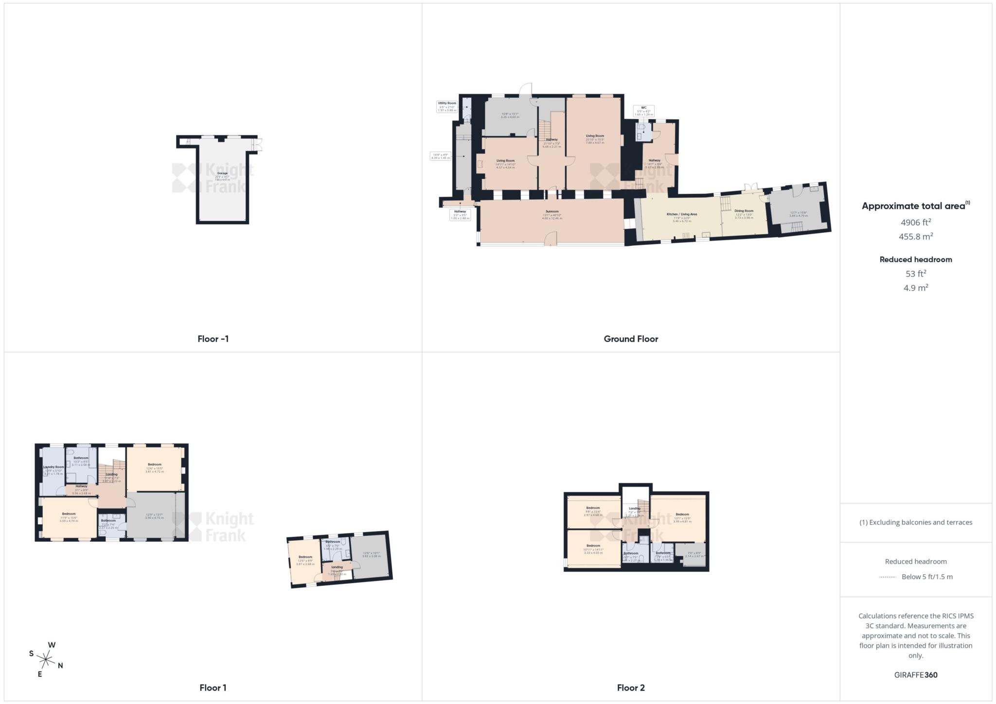 Upstairs, the principal bedroom suite spans the depth of the house and includes a dressing room and en suite. Four further bedrooms are arranged over the upper floors, one also en suite, along with family bathrooms and a practical laundry room.