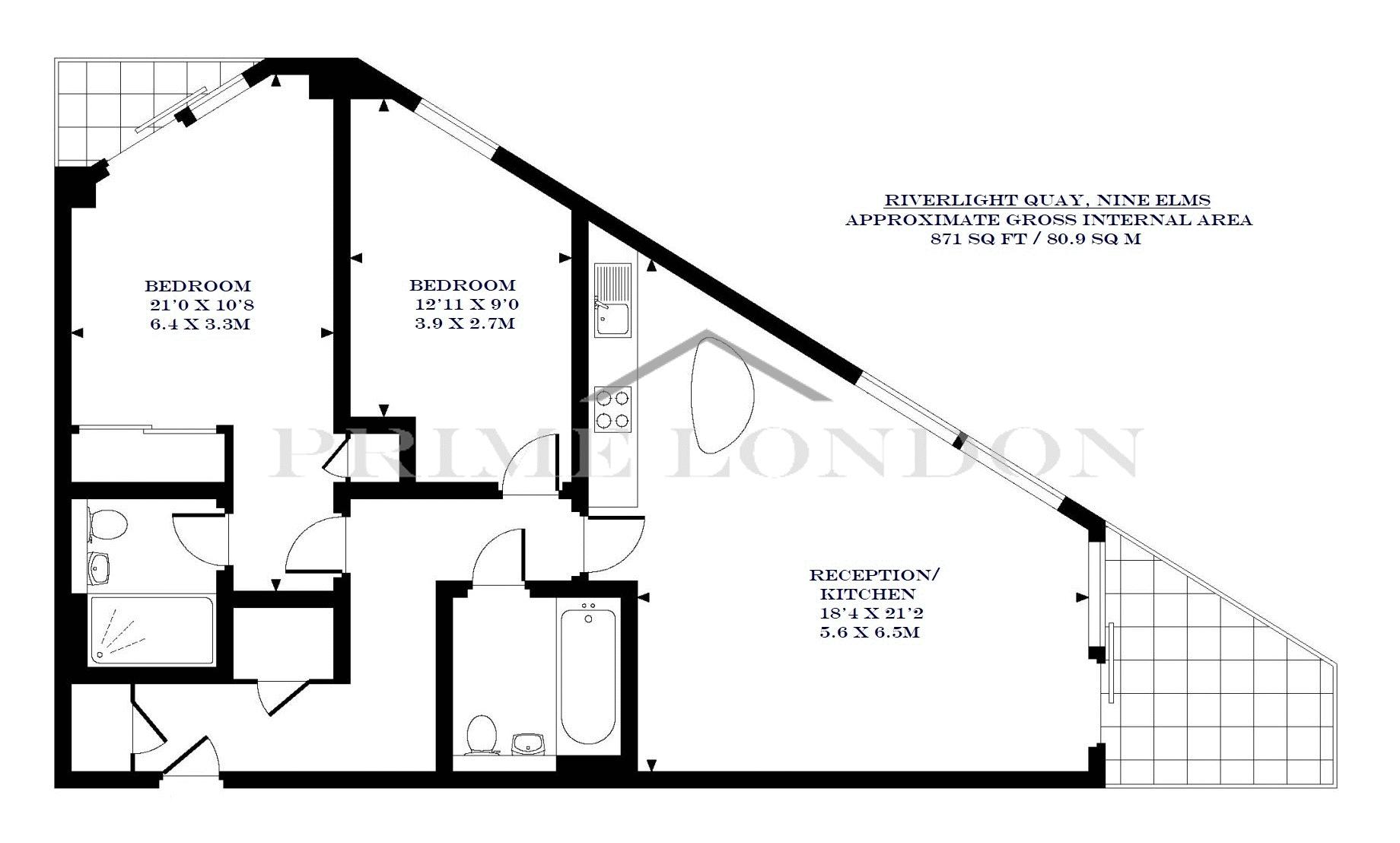 The 871 sq ft / 80.9 sq m property comprises a light-filled reception with open fully fitted kitchen, two balconies, family bathroom and en suite to master, two equally well sized double bedrooms. Everything is finished to a high specification level throughout, and the property further benefits from having comfort cooling and under floor heating.