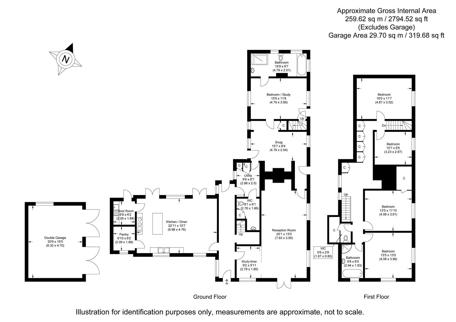 Detached Double Garage - Access is via two pairs of timber doors with window overlooking the garden, eaves storage space, power and lighting connected and also providing potential for conversion subject to needs and relevant approval.