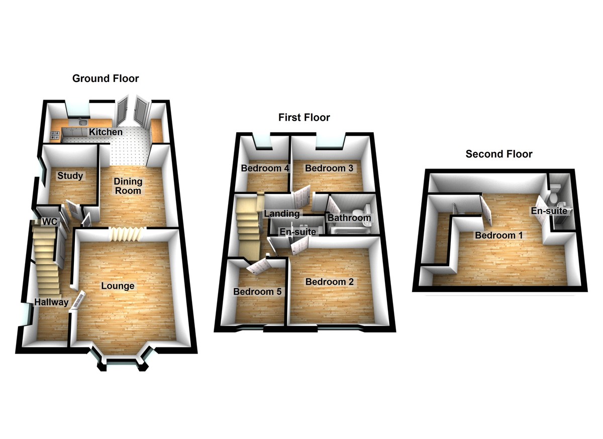 The first floor accommodation comprises four bedrooms, two doubles and two singles. Bedroom two has the benefit of an en suite shower with WC and wash hand basin. The other three bedrooms are supported by the main bathroom which offers a modern three piece suite comprising panelled bath, low flush WC and wash hand basin.