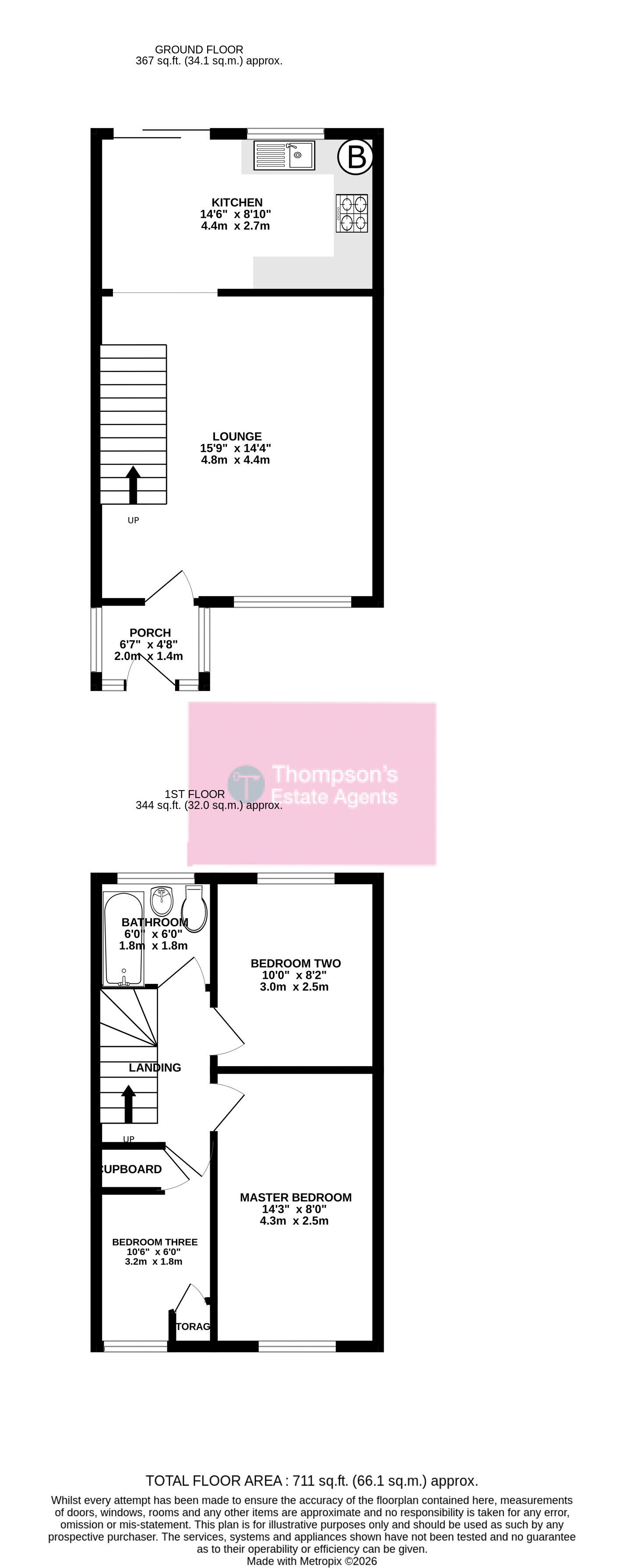 Vinyl flooring, two ceiling light points, wall mounted radiator, plug points, double glazed window and double glazed sliding patio doors onto the rear garden.Fitted with a range of gloss wall and base unit cupboards with roll top worksurfaces. Integrated four ring gas hob with stainless steel splash back, over head extractor and electric oven. Sink with drainer and mixer taps. Space for washing machine and fridge freezer.Combi boiler fitted in 2025.