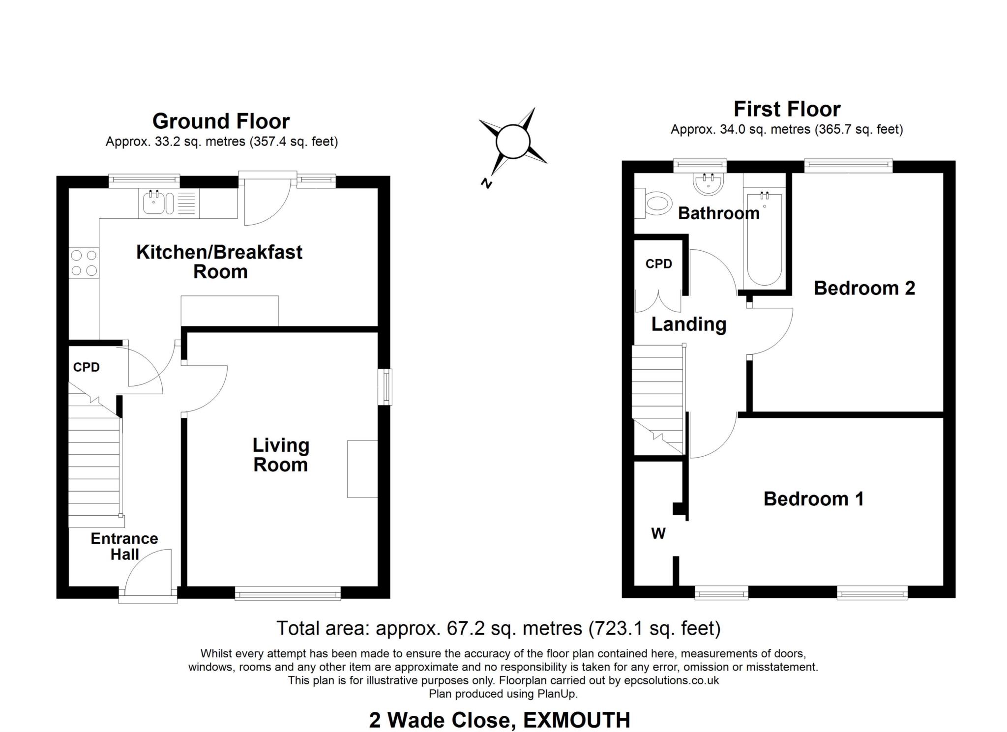The ground floor accommodation comprises a living room and a kitchen/dining room, while on the first floor there are two double bedrooms and a bathroom.