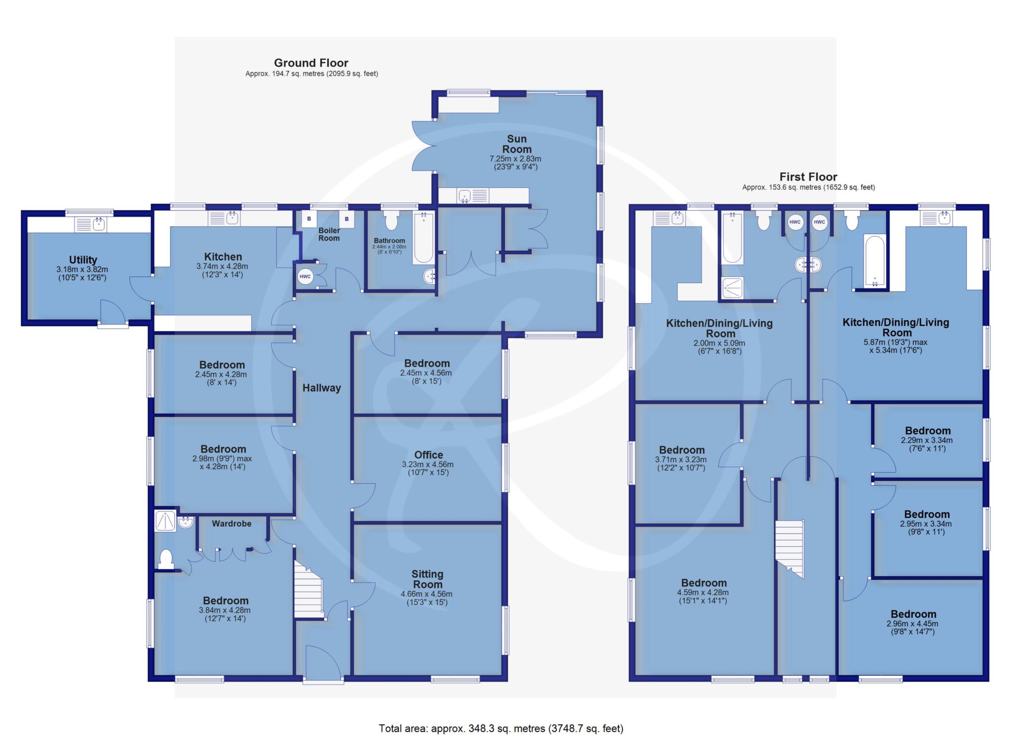 This floor also features four spacious bedrooms, one with an en-suite shower room, a family bathroom, home office, and utility room, creating an adaptable and generous layout suitable for family living or multi-generational use.