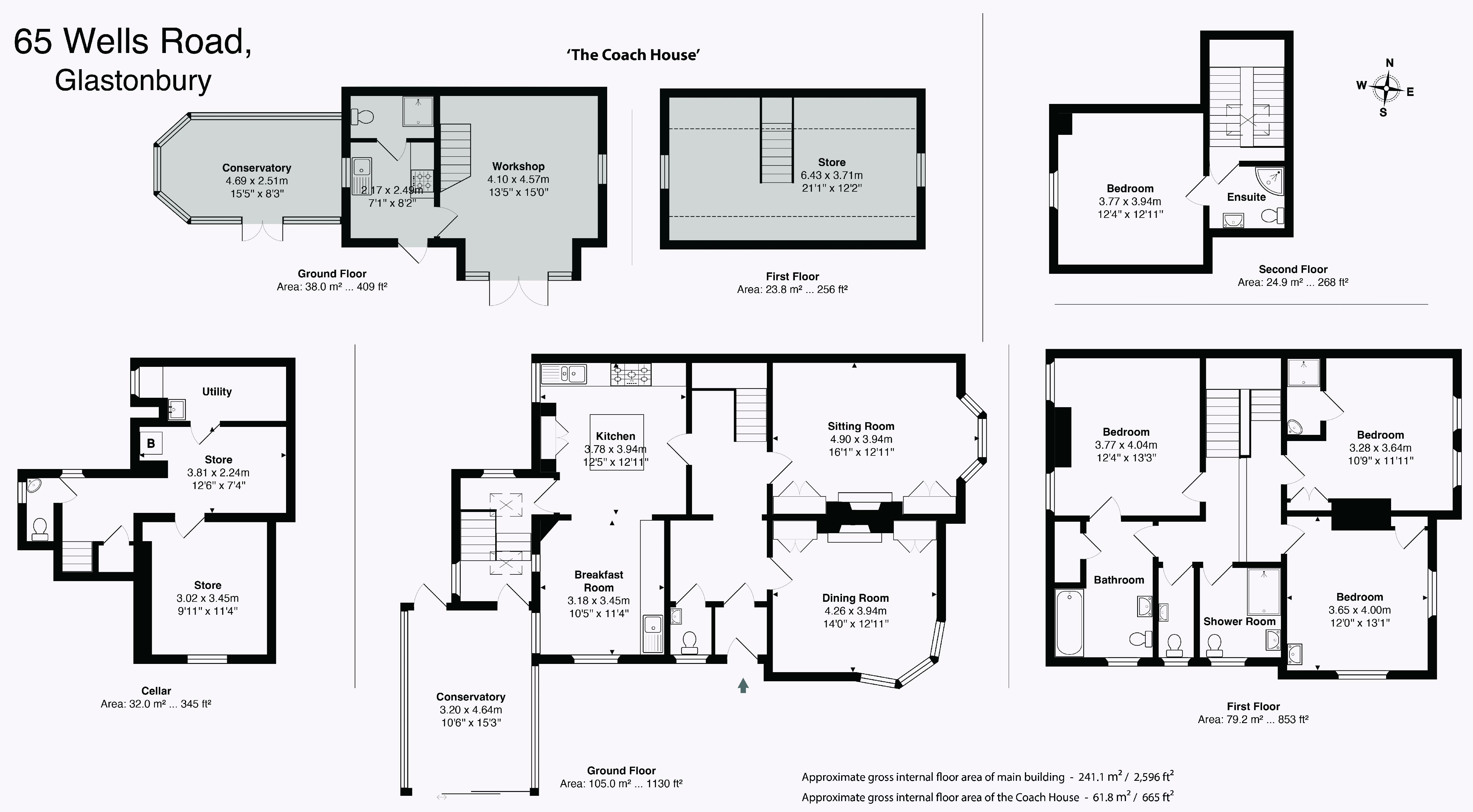 The house has a covered porch, an entrance hall, central hallway, cloakroom, dining room, sitting room, 22ft kitchen/breakfast room, conservatory and stairs to the cellar. In the cellar there is a snug/store, utility room and a further storeroom. On the first and second floor are 4 bedrooms and 4 bathrooms.Outside there is a gated drive, plenty of parking for up to 5 cars and mature gardens to the front, side and rear.The Coach House has a kitchen, shower room and sitting room/workshop on the ground floor and a 21ft second floor in the eaves. There is also an attached conservatory.