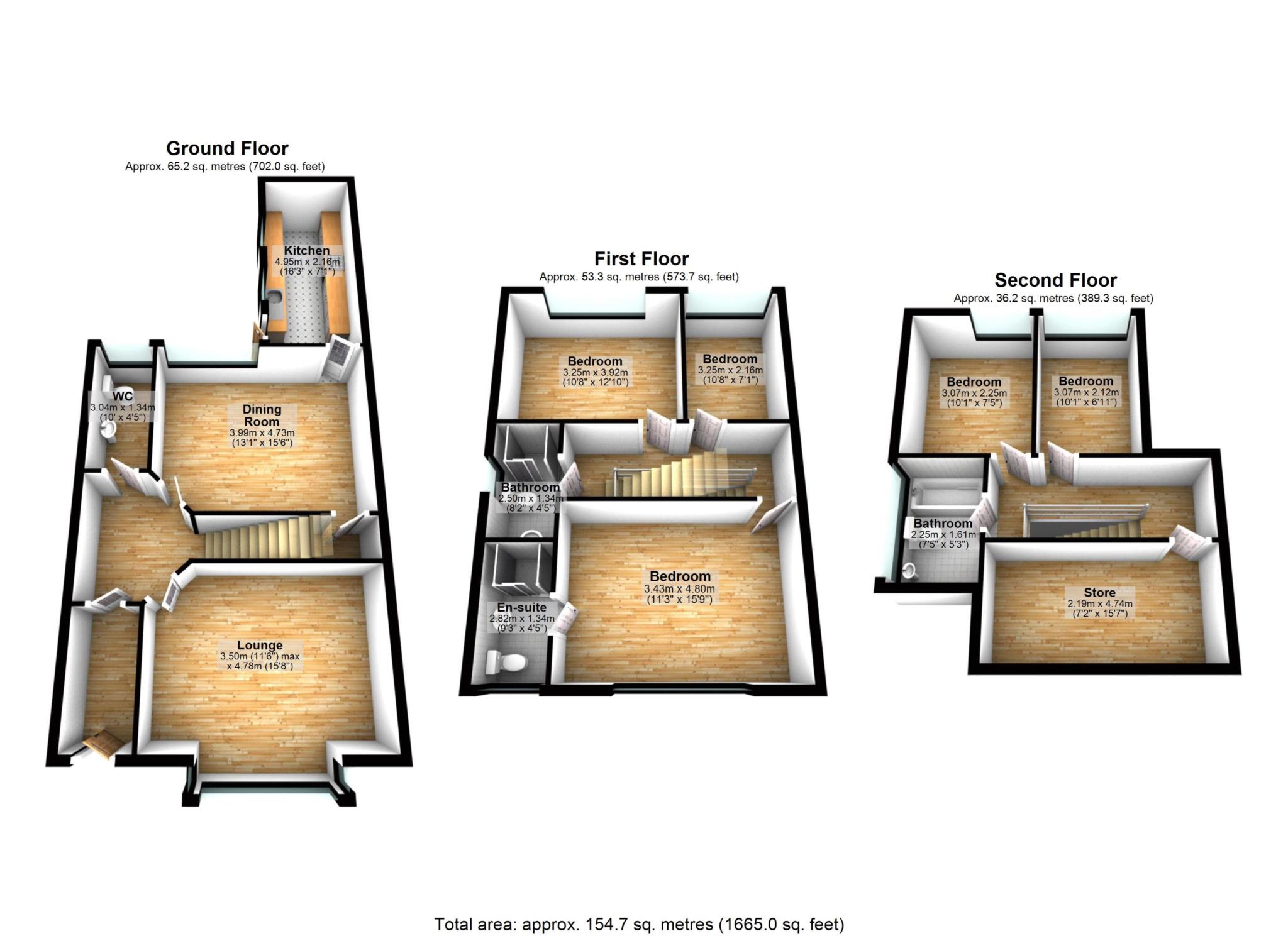 The first floor houses three bedrooms, two of which will accommodate a double bed and takes advantage of two bathroom facilities.