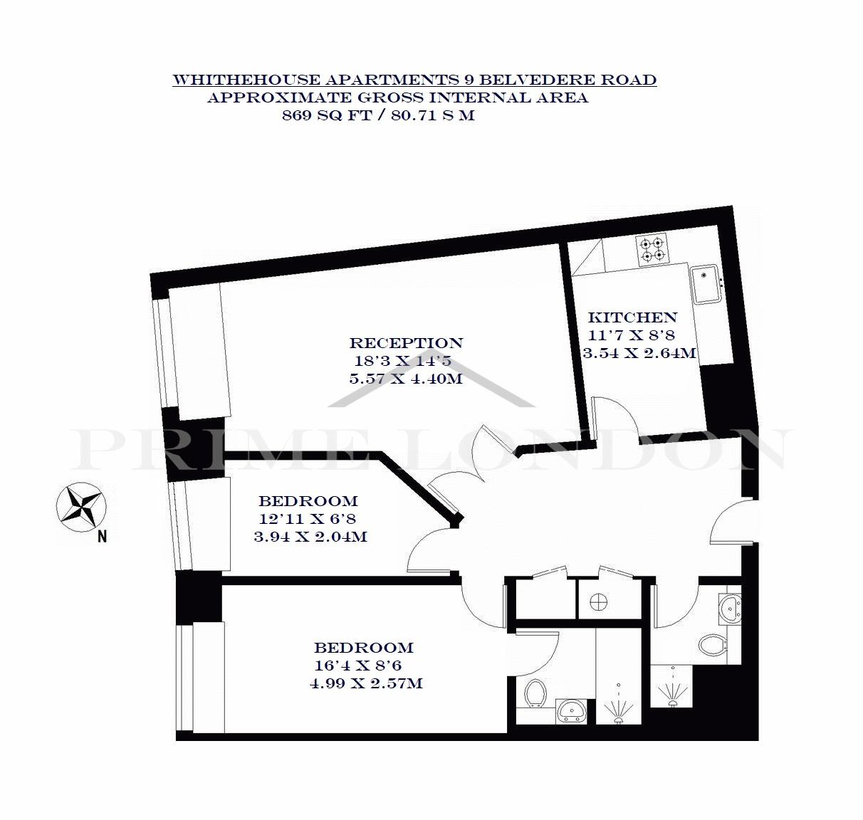 The apartment offers a large reception with dining area, two double bedrooms with built-in storage, fully fitted kitchen, two family bathrooms (one en suite), and separate large storage cupboard.