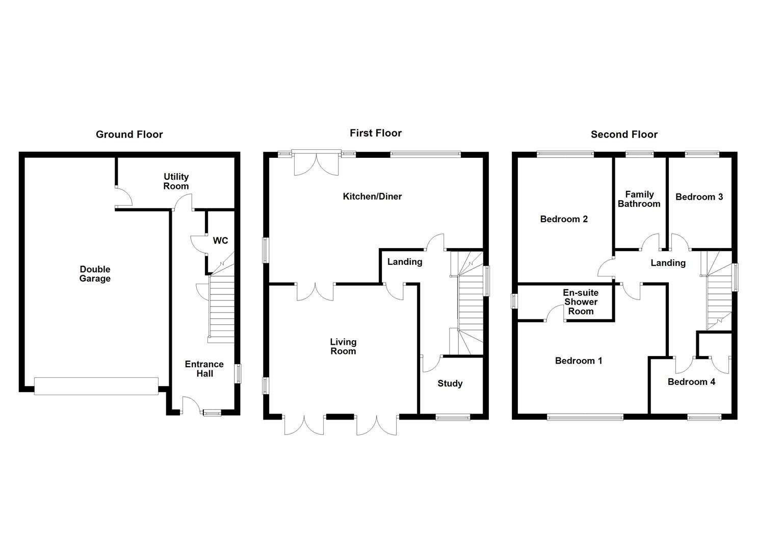 The accommodation comprises an inviting entrance hall, utility room, integral double garage, and a ground floor w.c. The first floor landing leads to a contemporary open plan kitchen/diner, a spacious living room, and a dedicated study. A further staircase ascends to the second floor, providing access to four well appointed bedrooms and a modern house bathroom. Externally, a sweeping tarmacadam driveway offers ample off road parking for multiple vehicles. To the rear, the beautifully landscaped tiered garden features paved patio areas, a tranquil pond with a water feature, a timber shed, and a substantial summerhouse.