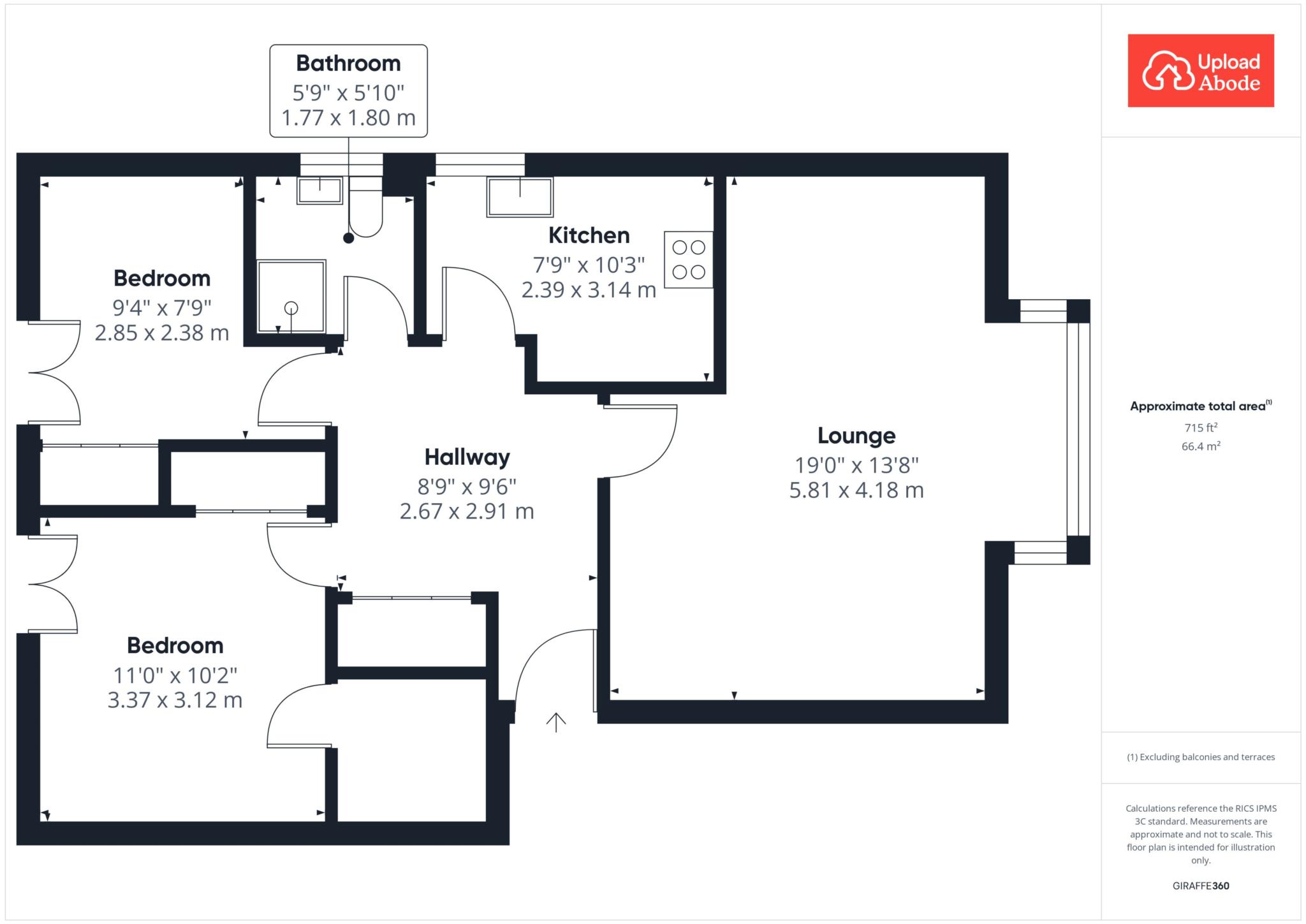 Both bedrooms are generous doubles and benefit from built-in wardrobes, while the bathroom is finished with sleek grey and black details and includes a spacious
