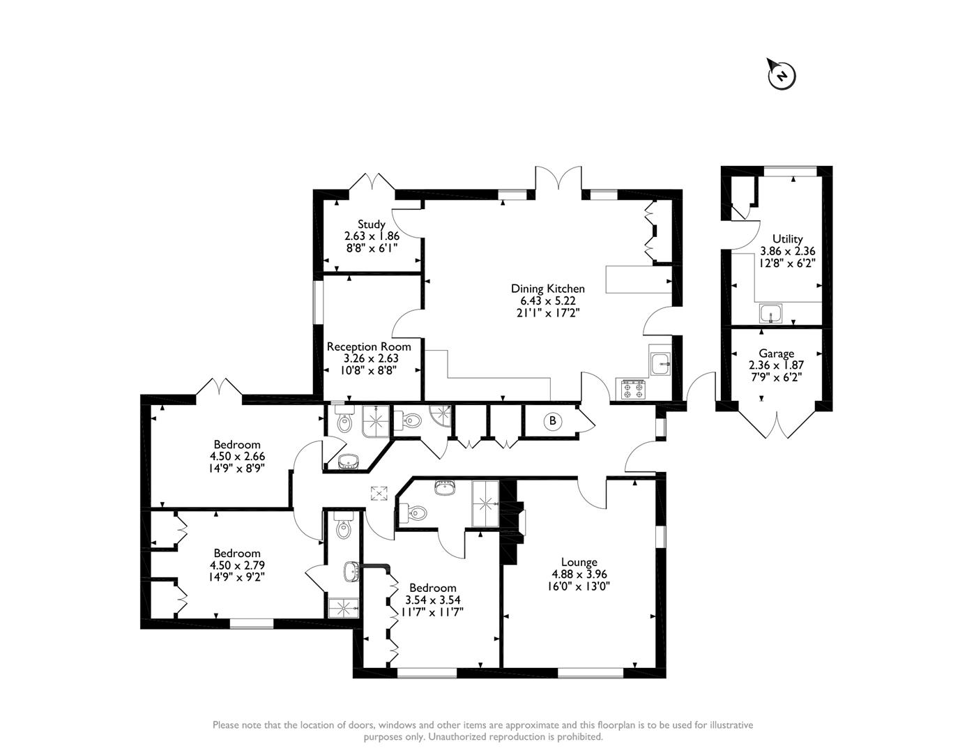 A central hallway with ample storage gives access to the bedroom and bathroom accommodation plus, the main reception room. The main living room is a generous size and is complete with a feature fireplace with a log burning stove inset. There are three double bedrooms, all complemented by ensuite shower rooms and two with built-in wardrobes and one with a French door opening out to the patio and garden beyond.