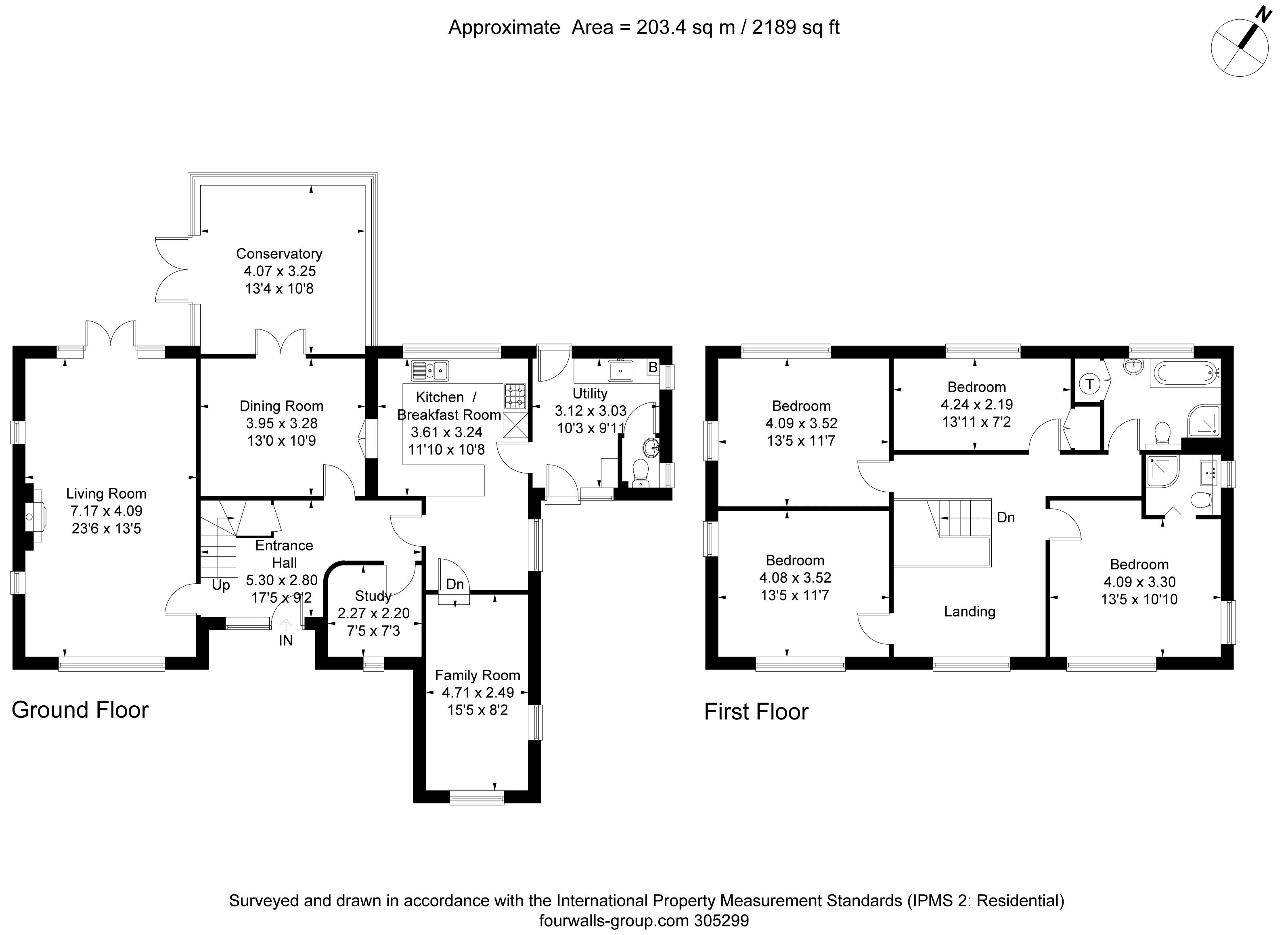 A storm porch shelters the front door which leads into the entrance hall. To the left is the large sitting room with a stone fireplace with a multi fuel stove. It has windows and French doors on 3 sides which combine all day to flood the room with sunlight. Also off the hall are a study and a dining room which opens into a conservatory with French doors into the garden.The heart of the house is the kitchen /breakfast room and the adjoining family room, perfect as a playroom, TV room or snug.