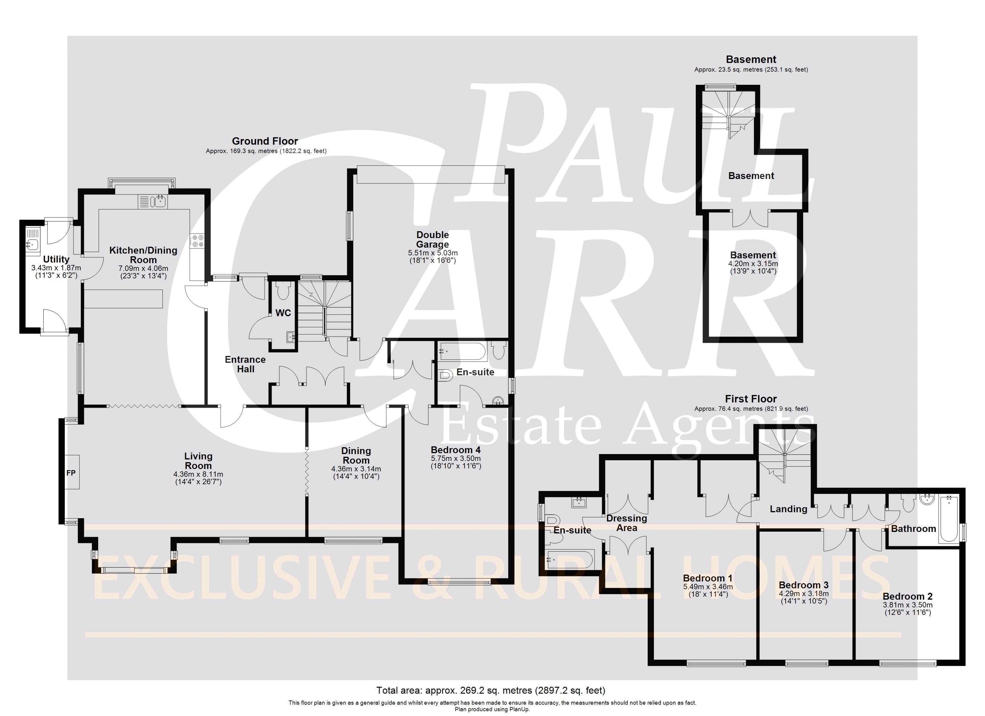 Stepping through the front door, the entrance hall has doors leading to the kitchen, living room, dining room, double garage, ground floor bedroom and guest wc. Stairs rise to the first floor, and a door leads to a further staircase leading down to the basement. The kitchen/diner has views over the front and features a range of wall and base units with worksurfaces over and an integrated double oven and hob. Folding doors open into the living room, and a further door leads to the utility room. The spacious living room enjoys views over the private rear garden with patio doors leading out. Folding doors lead to the dining room with views over the rear. The ground floor bedroom benefits from a range of fitted bedroom furniture and views over the rear garden. A door leads to an en-suite featuring a bath with shower over, low level wc and wash hand basin. To the first floor, the principal bedroom is a particularly well proportioned room with views over the rear garden and a range of fitted wardrobes. A dressing area with further built-in wardrobes leads to an en-suite featuring a bath with shower over, low level wc and wash hand basin. The two further double bedrooms both benefit from having a range of fitted wardrobes and have access to the family bathroom with bath having shower over, low level wc and wash hand basin.