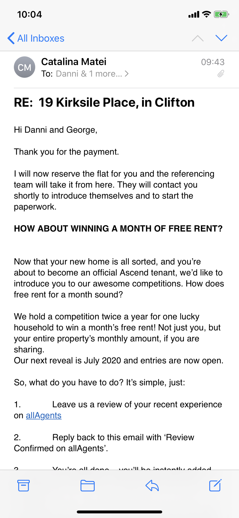 I’ve had a brilliant experience with Ascend. Catalina is amazing! Any questions I had over email/phone she would get back to me straight away. She went out of her way to get me in for a viewing too. Would recommend and use this company again.