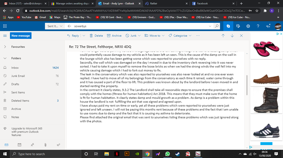 Sowerbys well what can i say, They do not look after their Tennants who have been with them for years without fail on rent and they will not get any problems fixed in a property you live in just email the landlords and make you live in a house with Mould and Damp and when the heating packs in due to cowboy Boiler Man they will try and say you have run the boiler low even though you have just got oil for the tank Please see attached photos and proof of how they treat there Customers/Tennants The Property i moved in at 72 The Street, Felthorpe as you can see on the Inventory there was damp and mould in the house on arrival and now they are trying to charge me £1600 to cover Loads of random Costs ! I will be taking this to Citizen advice and get a solicitor involved in this matter ASAP Many Thanks Andrew Lynn