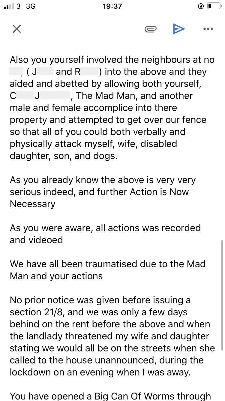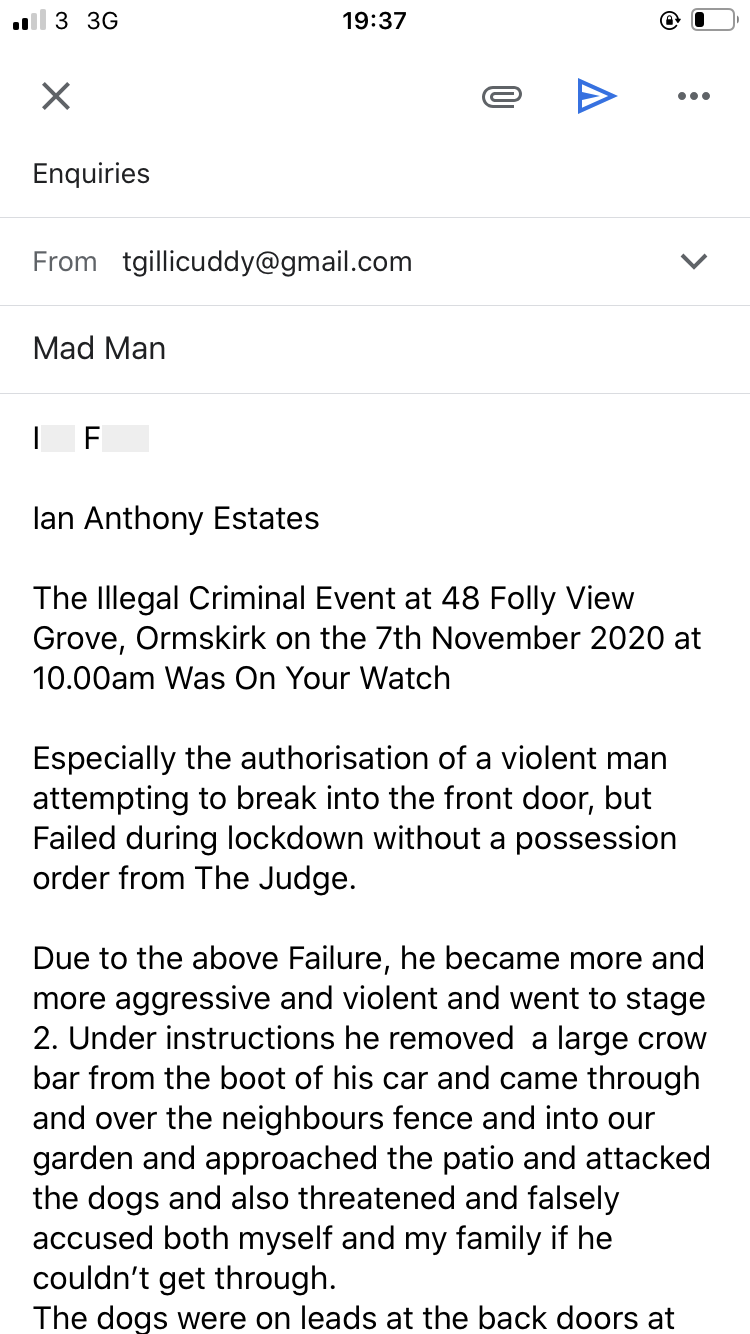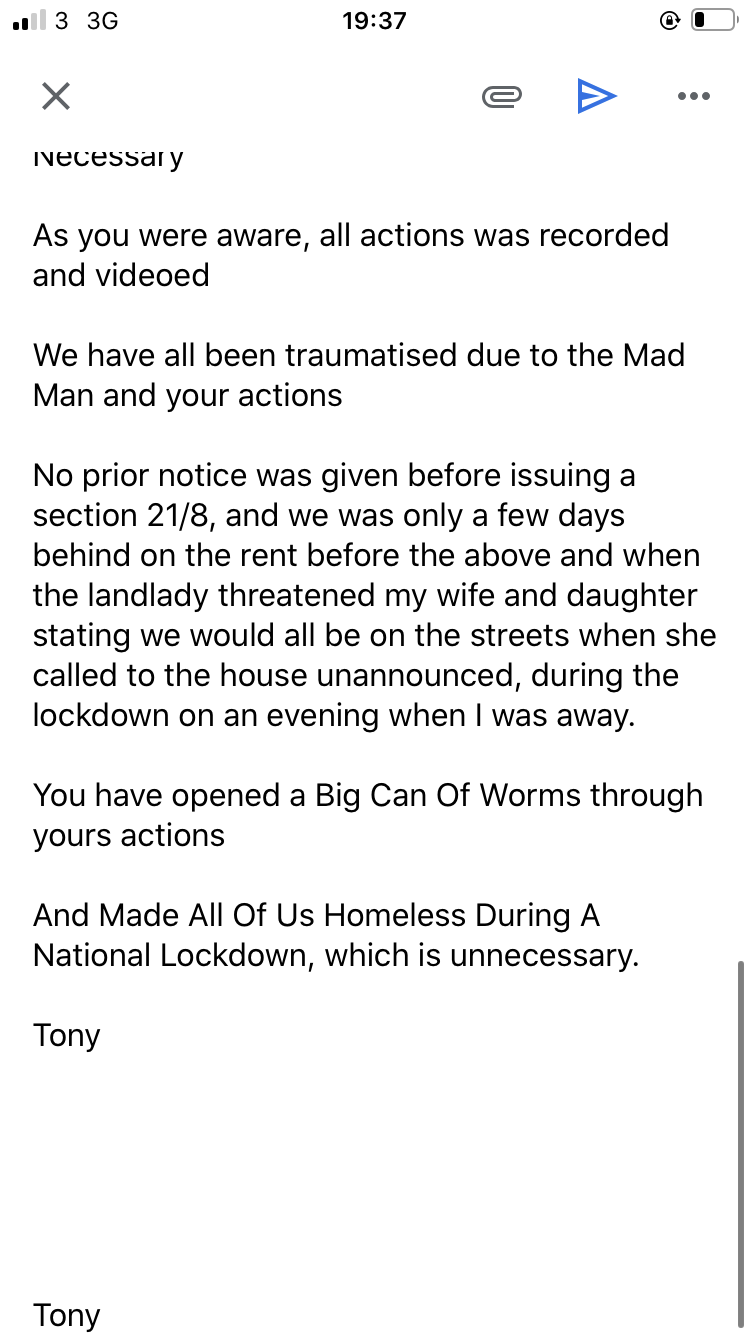 Both myself, wife and disabled daughter in a wheelchair have just been illegally evicted by IF from Ian Anthony Estates and CJ The Landlady during lockdown and isolation without a possession order from The Judge whilst paying rent. They have made us homeless and threw us all on the streets. These people are criminals and vigilantes in nice suits. They are currently under investigation by various authorities