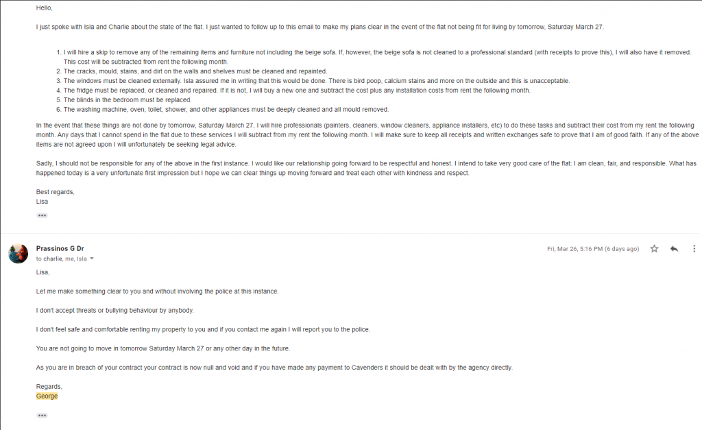 Had a nightmare experience with Cavender. They promised repairs, professional cleaning and removal of furniture prior to my moving in. The landlord and I both signed the contract and I paid my deposit and first month's rent. I visited the property two days before the move-in date and nothing was done. The house was dirty, filled with stuff, cracked walls, mould, and stains everywhere. Cavender ignored my calls, blamed the landlord, and refused to take responsibility. They were patronising and completely unprofessional. Eventually, I sent a very reasonable email to both Isla and Charlie, and the landlord, who proceeded to threaten me with calling the police and cancelling my tenancy due to me "breaching my contract". Cavender refunded my money but refused to offer any other help. I am currently homeless due to their complete and utter negligence.
