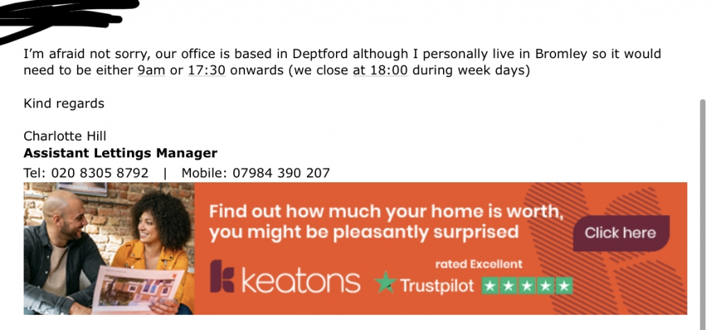 We got in contact with Keatons to arrange a viewing for a property that had become available to rent on Rightmove. We originally requested an afternoon viewing, to my surprise we was told by Charlotte who is the Lettings manager that she only does viewing either on her way to work or on her way home from work due to location of the property which to me is ridiculous. Why list a property that you don't have time to attend to conduct viewings? Nevertheless we arranged to view the property at 17.30 the following day, to my surprise I opened my email at 16.47 and I had an email from Charlotte advising she was “swamped” with work and couldn't make it. By this time we had already left to attend the viewing, when cancelling a viewing with less than an hours notice it would be common courtesy to at least give a call to advise as not everybody checks their emails as regularly as I do. I will be contacting Jay who I have been told is the office manager as the service so far has been shocking.