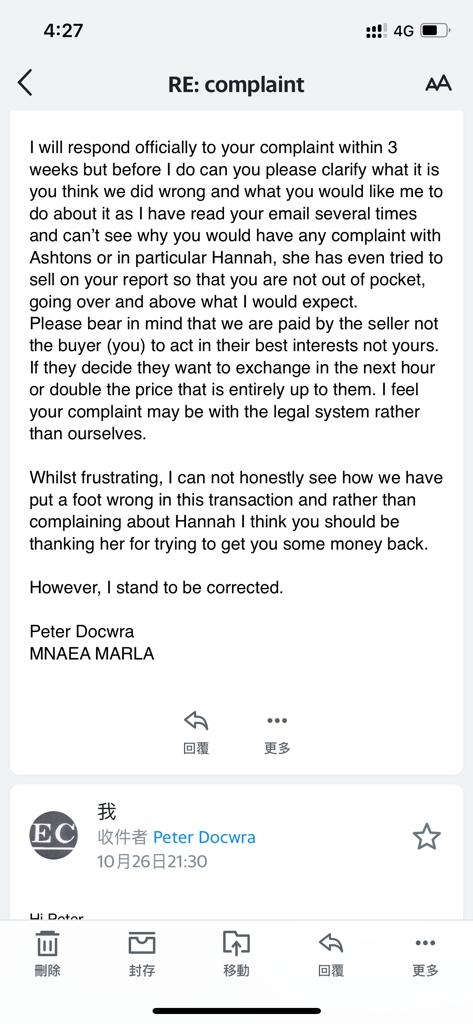 Awful & Full of lying company ! The negotiator called Hannah gave a wrong and misleading transaction date to buyer when I make an offer. After 3 weeks (after viewing) ask me to exchange contract, but the solicitor said not yet ready. How come documents not yet ready and can make exchange contract? ! Such misleading information caused me waste time and money to process on surveyor's report & solicitor. I follow up with compliant letter to Ashtons and ask for investigation this case. Sudden got her MD Peter Docwra rudely replied. Do you know what he replied? He terribly told me vendor pay for them and they are not serve buyer and don't know why I need to compliant even gave a wrong information by their staff... They deny their faults without investigation even promised to do so by official email. Shame on this company! IF you have property, go for other estate agents! This is Dreadful company ! Not reliable !
