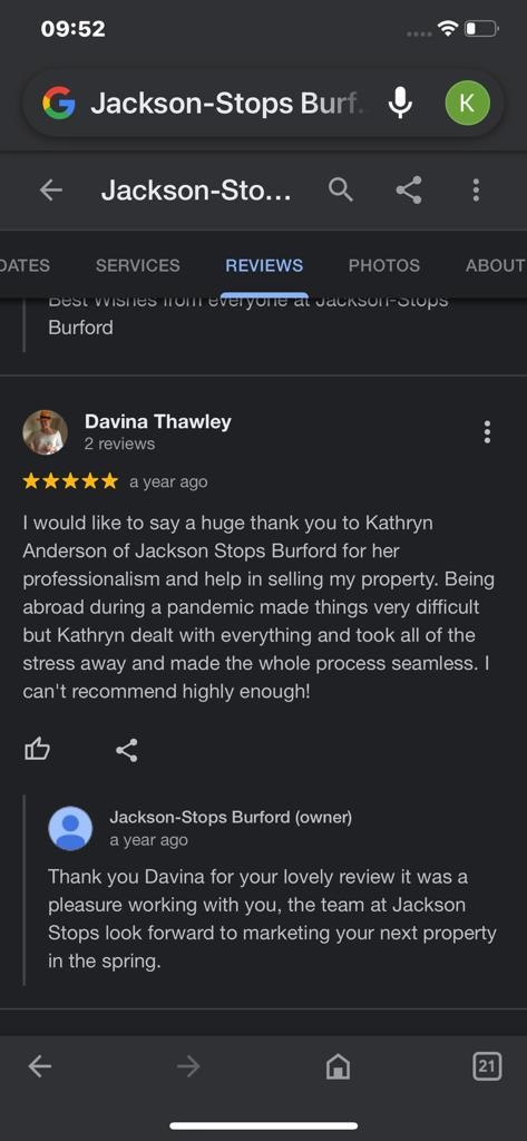 I would like to say how impressed my wife and I were with Kathryn Anderson at the Burford branch of Jackson-Stops. She was efficient, competent, professional and expeditious in securing a purchaser for our property and was so helpful in dealing with any prevailing situations that arose. I would... Read Full Review