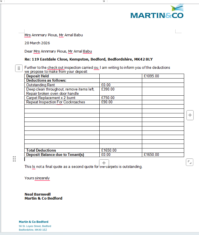 We had a very disappointing and frustrating experience with Martin & Co regarding the property at 119 Eastdale Close, Kempston, Bedford -MK42 8LY. We lived in the property three (3) years, during which the rent increased significantly from £975 to £1200. Throughout our tenancy, we did not receive adequate support in addressing maintenance issues. For instance, a cockroach infestation arose due to a faulty and outdated fridge provided by the landlord. When we reported this, we were asked to contribute half the cost of a replacement, which we found unreasonable given that white goods are the landlord’s responsibility. At the end of our tenancy, we were charged £390 deep cleaning and £90 the visits conducted by the agent after we left the property, despite having already paid £180 pest control services in January 2026 through Martin & Co. We do not understand the reasoning behind charging us £90 each visit made by your team to the property. Once tenants have vacated, it becomes the responsibility of the agentlandlord to manage, inspect, and maintain the property. In addition, we were asked to pay £750 carpet replacement. The carpet had undergone normal wear and tear over three years of use, with only minor damage; therefore, charging such a high amount full replacement appears excessive and disproportionate. Our deposit held with the Deposit Protection Service was £1,095, yet the total charges being claimed amount to £1,630. This level of charging is unreasonable and raises serious concerns about fairness and transparency. Furthermore, we have not received a clear or timely update regarding our deposit held with the Deposit Protection Service, the landlord is attempting to claim a total of £1630 cleaning, carpet replacement, and pestrelated issues. This is particularly concerning given that we maintained the property to a good standard throughout our tenancy, and no concerns regarding cleanliness were raised during inspections over the threeyear period. Overall, we found the service lacking in responsiveness, fairness, and accountability. We would strongly advise prospective tenants to exercise caution. Mr.Amal Babu Ph: 07831177488 Mail:amamolly271@gmail.com